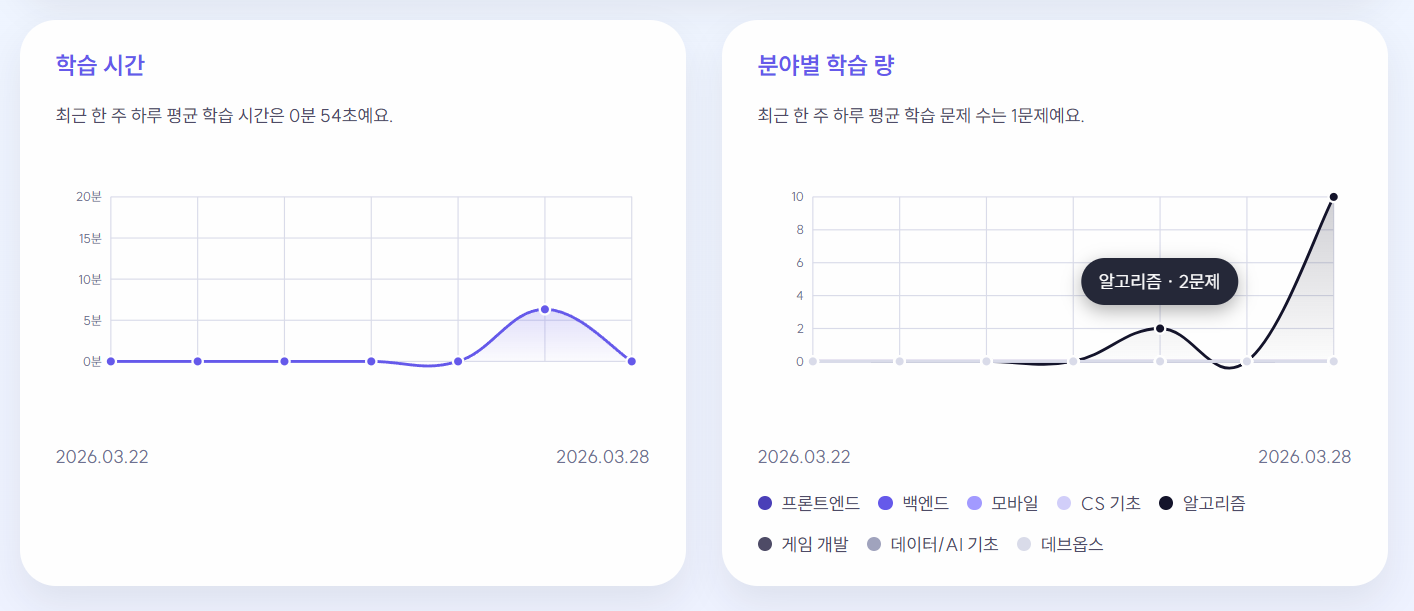 학습 시간 그래프와 분야별 학습량 그래프 모두 SVG 위에 Y축 눈금, grid line, 부드러운 곡선 path, area gradient, hover 포인트, popover를 직접 구현했습니다. 차트 라이브러리보다 제품 톤에 맞는 세밀한 제어가 가능했습니다.