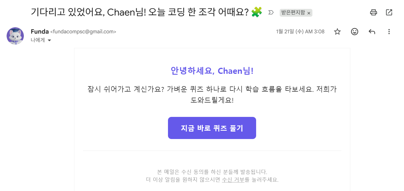 SM-2 기반 SRS가 복습 타이밍을 계산한다면, 정기 학습 알림 이메일은 그 시점을 실제 행동으로 연결하는 장치입니다. 로그인 화면의 수신 동의 → 설정 화면의 토글 → 메일 본문의 수신 거부 페이지까지 하나의 흐름으로 완성했습니다.