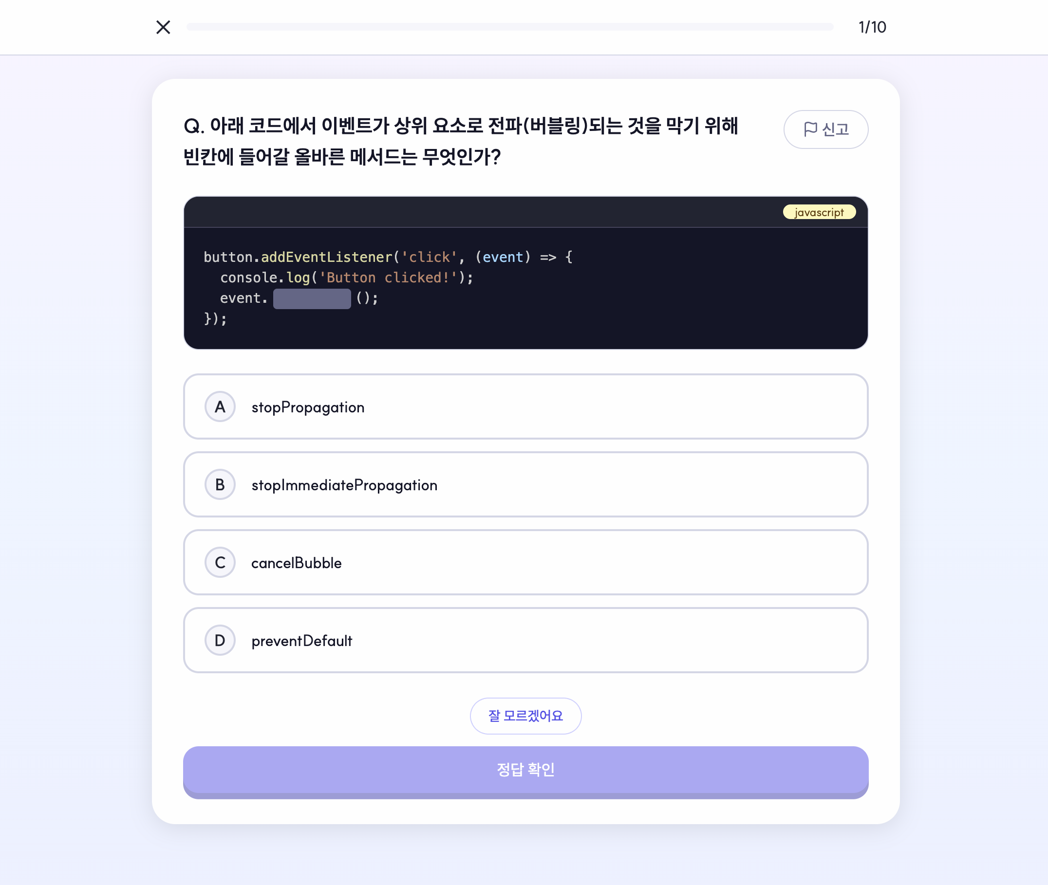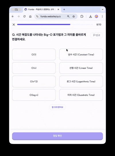 Funda는 객관식, OX, 매칭, 코드 분석 등 다양한 퀴즈 타입을 제공합니다. 각 타입은 단순 포맷 나열이 아니라 서로 다른 학습 목표를 전달합니다. 객관식은 핵심 개념 인지, OX는 오개념 교정, 코드 분석은 실행 흐름 추론, 매칭은 개념 간 관계 이해를 목표로 합니다.