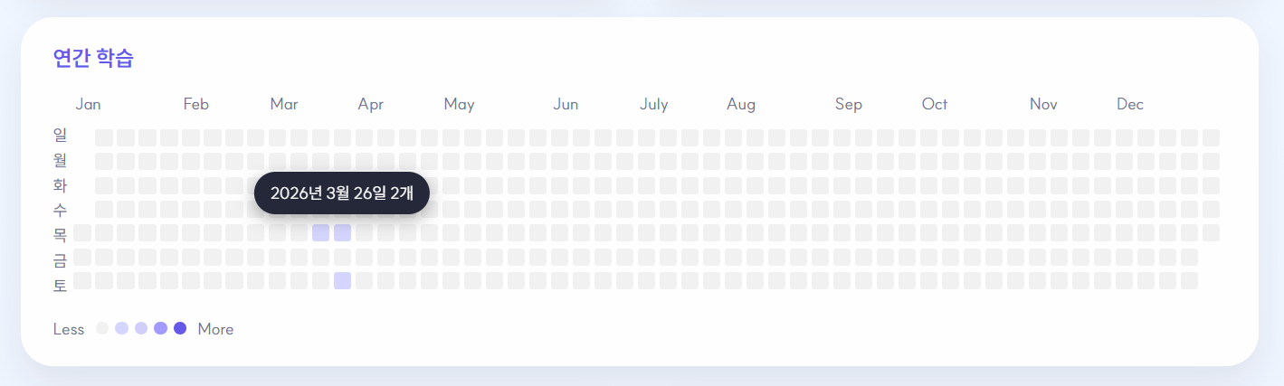 단순 div 그리드가 아니라 월 라벨, 요일 라벨, level 기반 색상 강도, hover/focus 툴팁을 포함한 학습 히트맵으로 설계했습니다. 기록이 없는 셀은 인터랙션에 반응하지 않고, 실제 기록이 있는 셀만 버튼처럼 동작하도록 해 정보 밀도는 높이되 인터랙션은 과하지 않게 유지했습니다.
