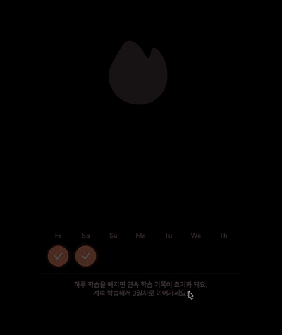 당일 첫 번째 풀이라면 Streak 화면으로 분기됩니다. 큰 숫자와 불꽃 아이콘, 주간 체크 상태, 다음 날 학습 유도 문구로 구성해 "연속 학습 기록을 이어간다"는 맥락을 전달했습니다.