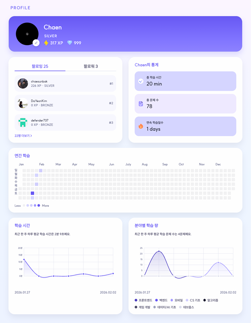 프로필 페이지는 단순 사용자 정보 화면이 아니라, 퀴즈 풀이 기록을 학습 동기로 다시 번역하는 개인 대시보드 역할을 했습니다. 연간 잔디, 최근 7일 학습 시간 그래프, 최근 7일 분야별 문제 풀이 그래프로 "얼마나 했는가"뿐 아니라 "언제 했는가", "어느 분야를 했는가"까지 한눈에 읽히게 만드는 것이 목표였습니다.