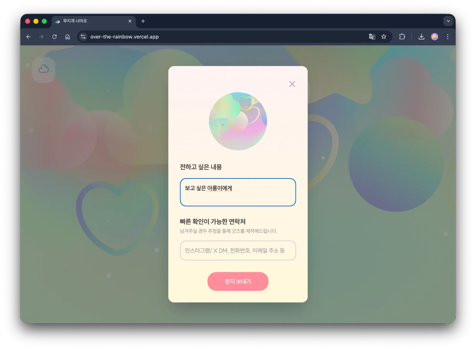 편지는 일반적인 카드 목록으로 배치되지 않습니다. 하트, 별, 구름, 원 형태의 SVG 오브젝트가 화면 위를 천천히 떠다니고, 사용자는 이를 눌러 편지를 열람하거나 새로운 편지를 남깁니다. 리스트를 스크롤하며 소비하는 느낌보다, 화면 속 기억 조각을 하나씩 발견하는 경험이 이 서비스의 정서에 더 맞았습니다.